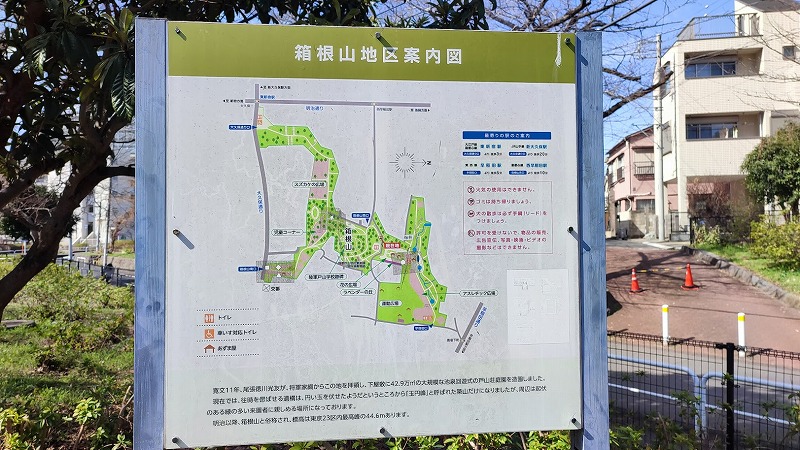 西早稲田駅から都道305号に沿って南へ。「新宿コズミックセンター前」交差点を左折したら、後はまっすぐ進むだけ。時間にして徒歩10分程度で箱根山に着きました。